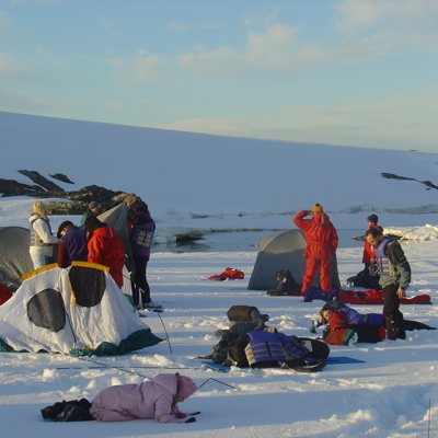 Na het avondeten is er voor wie wil de mogelijkheid om te ervaren hoe het is om te kamperen op de zuidpool. Alle materialen – inclusief slaapzak – worden verschaft en het is zelfs mogelijk om zonder tent met alleen je slaapzak op het ijs te slapen. Dat is eens wat anders dan kamperen tijdens een vakantie in Frankrijk... Tot laat kun je genieten van de stilte, de avondluchten en het idee dat je werkelijk héél afgelegen gaat bivakkeren. De zon gaat slechts een paar uur net onder de horizon en het blijft de hele nacht licht. Een vreemde maar o zo mooie gewaarwording om de oneindige ijsvlakte in het zachte, bijna onaardse schemerlicht gebaad te zien.