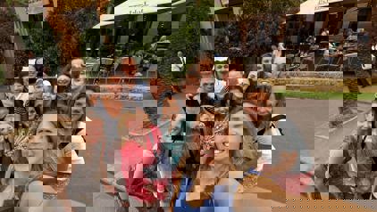 Liesbeth verwelkomt iedereen op het vliegveld bij de start van de reis. Liesbeth reist deze editie niet met de groep mee.