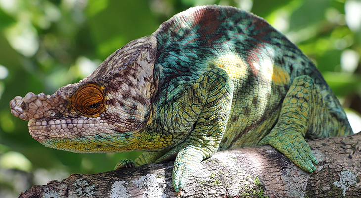 Het eiland wemelt van de kameleons in alle maten en kleuren. Onderweg nemen we dan ook de tijd om ze te zoeken en gaan een paar keer ’s avonds wandelen om de nachtsoorten zoals de dwergkameleon te vinden. Deze jongen spant zeker de kroon met zijn prachtige kleuren.