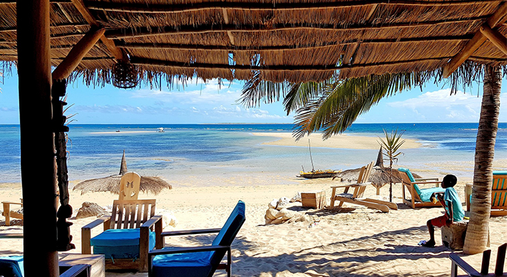 Madagascar heeft de meest geweldige eilanden en stranden. Wij bezoeken een van de stranden ten zuiden van Tulear. De resorts hebben vaak geen stromend water maar een emmer en mok met zoet water wat overigens geleverd wordt door een boot. Dit moet voldoen als douche. De resorts staan tussen kleine dorpjes, waar het normale leven gewoon door gaat. Superleuk om het strand af te lopen en het leven van de lokale bevolking mee te maken en de met de hand uitgehakte bootjes met zeilen gemaakt van rijstzakken, voorbij te zien varen.