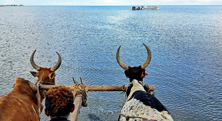 Om de stranden ten zuiden van Tulear te bereiken is het mogelijk om via de weg rijden, maar de wegen zijn erg slecht en reizen verloopt traag. Om deze reden is een watertaxi in het leven geroepen. Maar omdat er niet overal steigers zijn, worden wij met een hoogkar naar de speedboot gebracht. Even wat anders!
