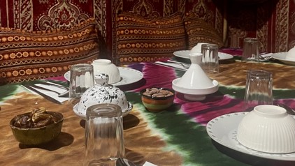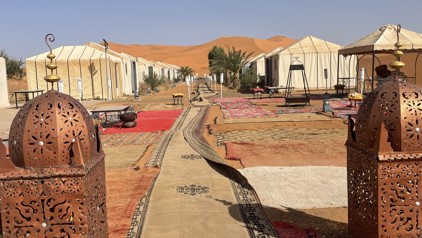 Na ongeveer anderhalf uur rijden in de bus kwamen we dan toch echt aan in Erg Chebbi, een van de woestijnen van Marokko. Het was indrukwekkend om het landschap te zien veranderen naar uitgestrekte zandvlaktes en duinen. Het laatste stukje in de bus was dan ook een hele ervaring over de hobbelige zandwegen. Ergens tussen de duinen verscheen een kasteelachtig gebouw, het hotel waar ons tentenkamp bij hoorde. Hier moesten we overstappen op jeeps om bij onze accommodatie te komen. Ik wist van tevoren dat we een nacht in een tent zouden slapen midden in de woestijn. Maar dit waren geen tenten meer te noemen. Het waren een soort minihuisjes met airco en een eigen badkamer. De tenten zagen er prachtig uit en stonden in een soort straatje naast elkaar. Vanbinnen waren ze groter dan ik dacht, met mooie tapijten op de vloer en een knusse inrichting. Elke tent had een andere kleur en stijl. Er was ook een gezamenlijke tent waar we als groep konden eten en waar we koud drinken konden bestellen. Vlak voor de gezamenlijke tent was er een mooie plek gemaakt met zitjes, om ‘s avonds rond een kampvuur te zitten.