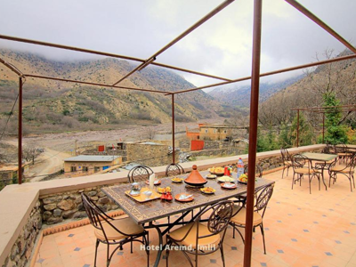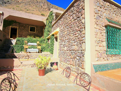 Aremd guesthouse in Arroumd, net buiten Imlil, is een charmante en authentieke, maar eenvoudige accommodatie voor wandelaars. Het is gelegen in de buurt van de rivier en kijkt uit op de berg Toubkal en biedt prachtig uitzicht over de valleien.
